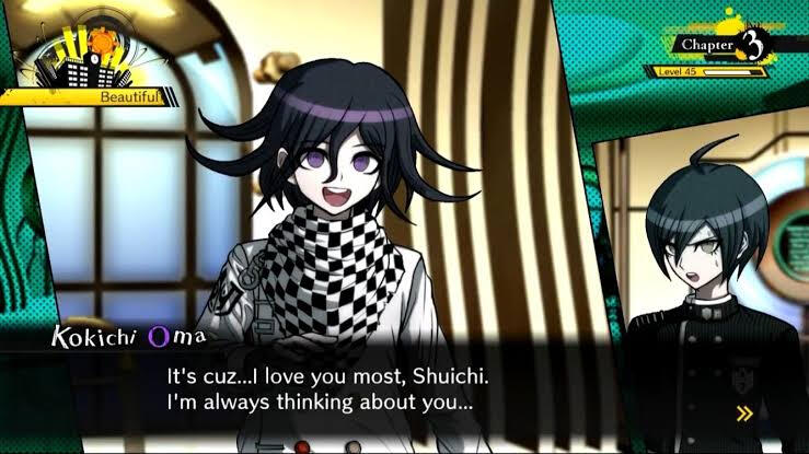 The way Kokichi says “the man I fell in love with” referring to Saihara in chapter 4, in an unskippable scene. The way they’re basically two sides of the same coin, truth and lies, aka basically v3.