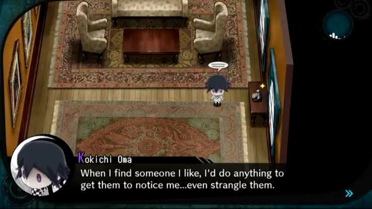 In chapter 4, or more exactly when Shuichi was about to exit from the virtual world, Kokichi calls Shuichi and talks about how "useful he is" and how he wants to form alliance with him, at the same time trash-talking Kaito. Shuichi, naturally got mad then exit without saying anything. Kokichi mumbles to himself about being "rejected" but then says that he won't give up that easily. He stated that "When I find someone I like, I'd do anything to them to notice me...even strangle them."